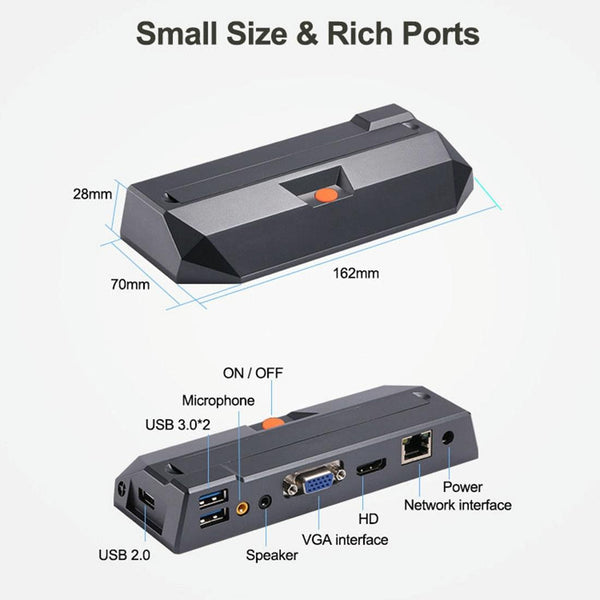 12. Ports: HDMI, VGA, USB2.0x3, RJ45, ON/OFF, SPK, Mic, DC-in