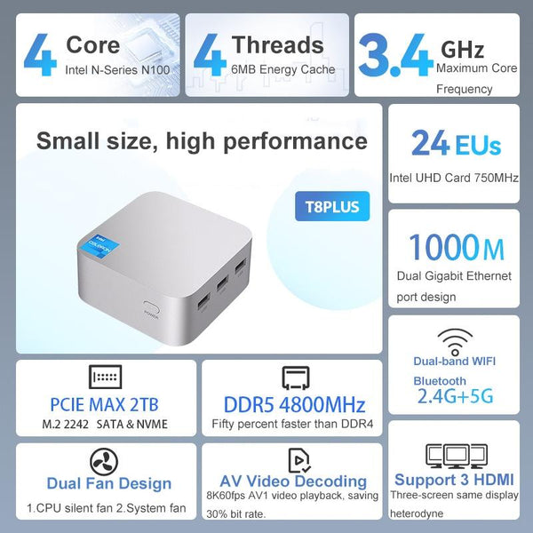 T8Plus Alder Lake-N100 4K Dual Band WIFI Bluetooth Office Game Portable Mini PC, Spec: 16G 1TB US Plug