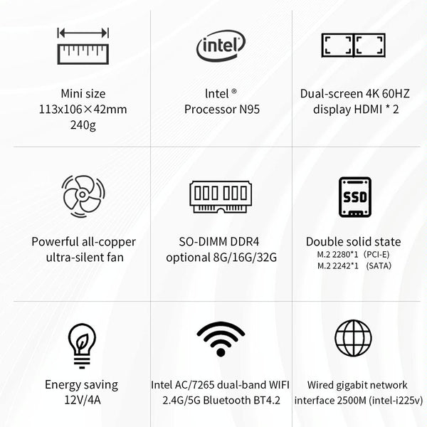 1. CPU: Intel Alder Lake-N95 4-core 4-thread 1.7GHz-3.4GHz