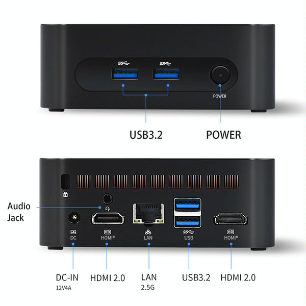 7. Interface: USB3.2x4, HDMI2.0x2, RJ45x1, Audio jackx1, DC-inx1