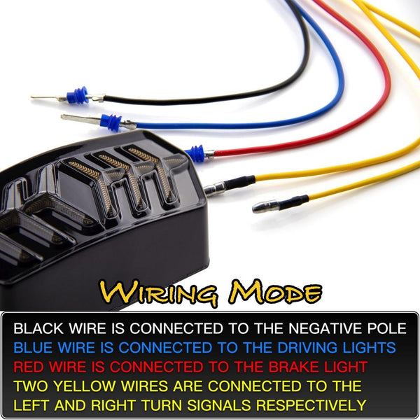 10. Wiring method: the black wire is connected to the negative pole, the blue wire is connected to the running lights, the two yellow wires are connected to the left and right turn signals, and the red wire is connected to the brake lights