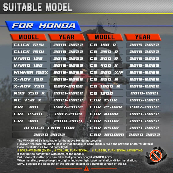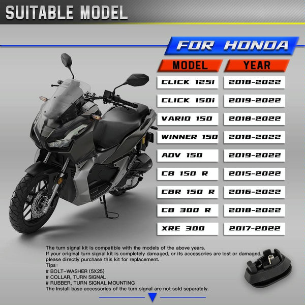 CLICK 125 I / CLICK 150 I / VARIO 125 / VARIO 150 / WINNER 150 X / X-ADV 150 / X-ADV 750 / NSS 750 X / NC 750 X / XRE 300 / CRF 250/L / CRF300l rally / AFRICA TWIN 1100 / CB 150 R / CB 250 R / CB 300 R / CB 400 X / CB 500 X/F / CB 650 RVCB 1000 R / CB 1300 / CBR 150R / CBR 250RR / CBR 400R / CBR 500R / CBR 650R / CBR 1000RR