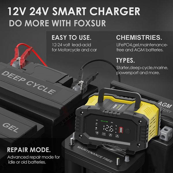 FOXSUR 12V / 24V 10A Portable Motorcycle Car Smart Battery Charger(EU Plug)