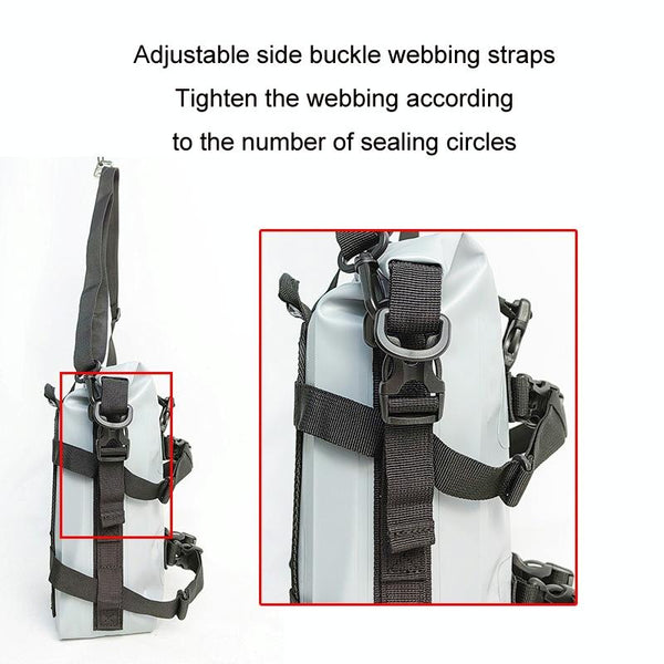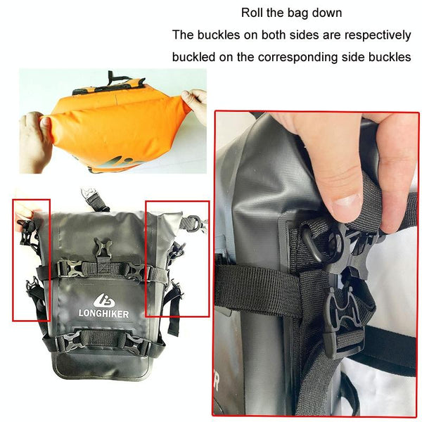 5. Roll up the mouth of the bag downwards, and fasten the buckles on both sides to the corresponding side buckles respectively