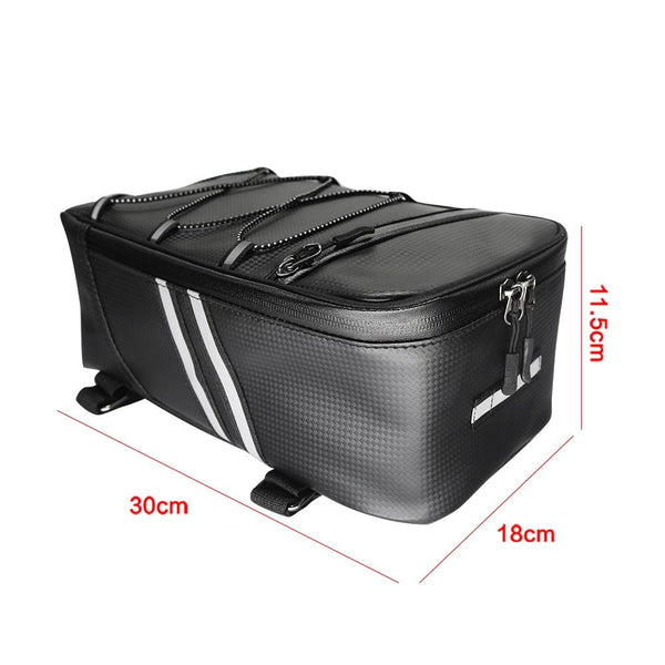 1. This bike trunk bag not only made of water-resistant PU material and waterproof zippers, can be full waterproof during cycling, but also with Large area of reflective cloth stitching design makes night travel safer