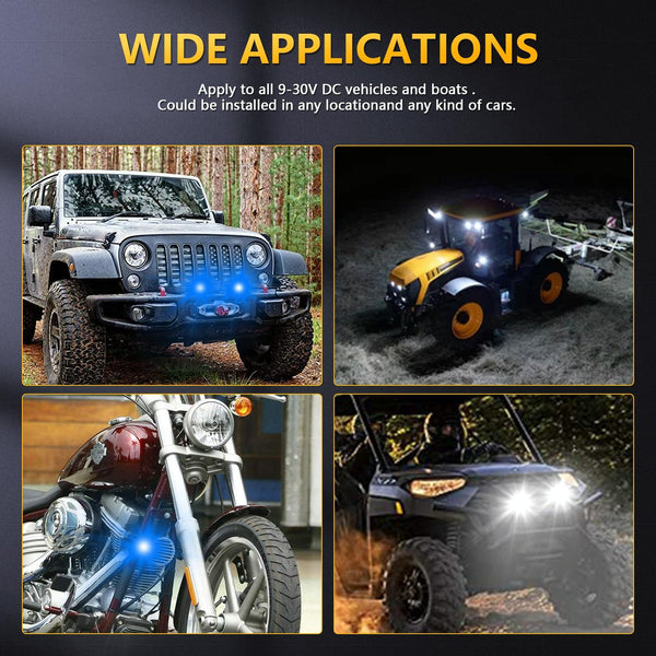 6. Widely used: Compatible with most motorcycles, jeeps, 4X4s, trucks, tractors, trailers, golf carts, pickup trucks, cars, motorcycles, SUVs, ATVs and boats. It can also be used as indoor and outdoor lighting, such as garden lighting, backyard lighting, off-road lighting, reversing lights, architectural lighting, etc.