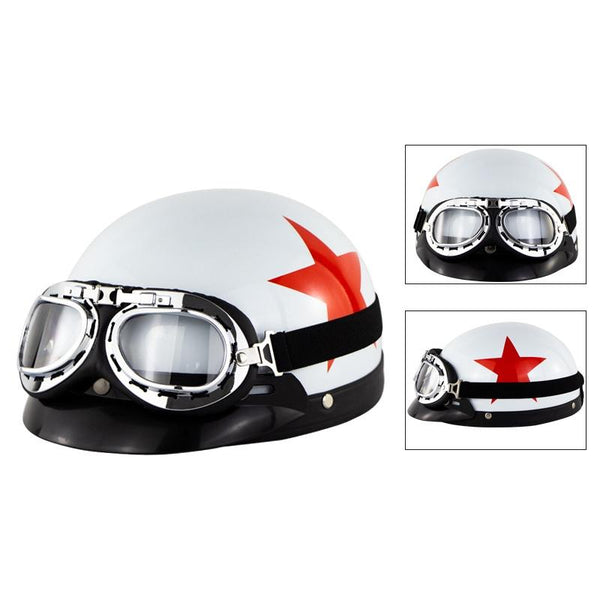 Soman Electromobile Motorcycle Half Face Helmet Retro Harley Helmet with Goggles(Bright White Red Star)