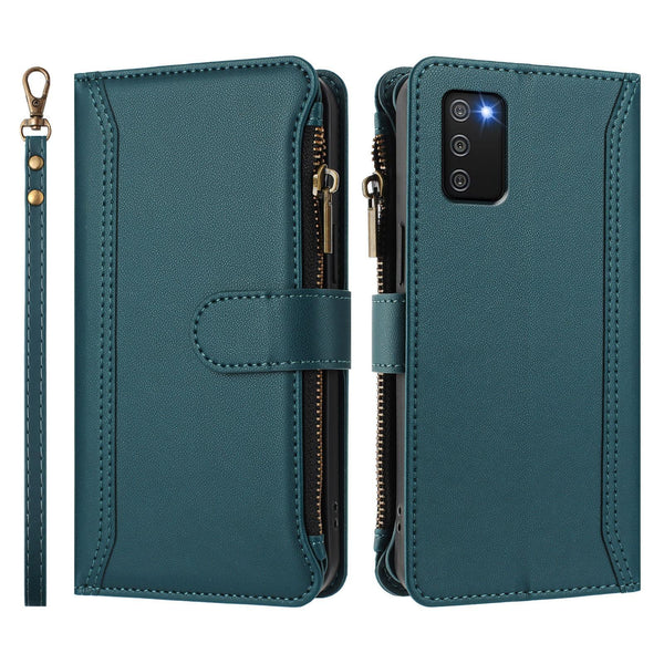 For Samsung Galaxy A02s 166mm Magnetic Closure Nine Card Slots Zipper Leather Case with Hand Strap(Dark Green)