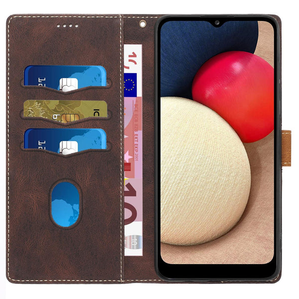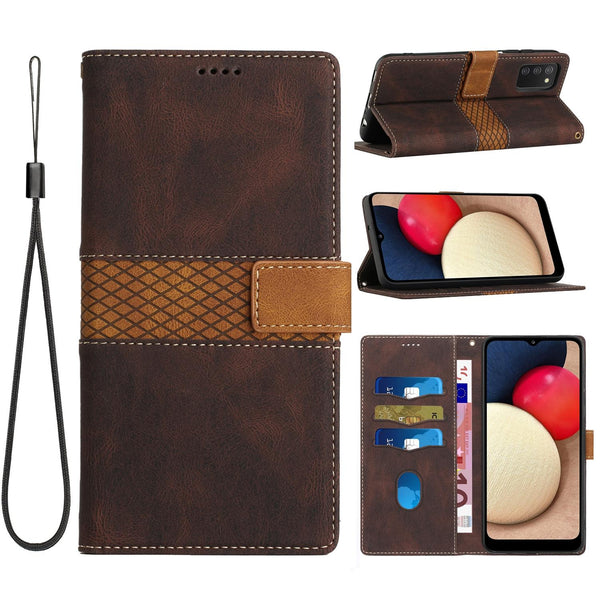 For Samsung Galaxy A03s 164mm Grid Stitching Leather Phone Case with Lanyard(Brown)