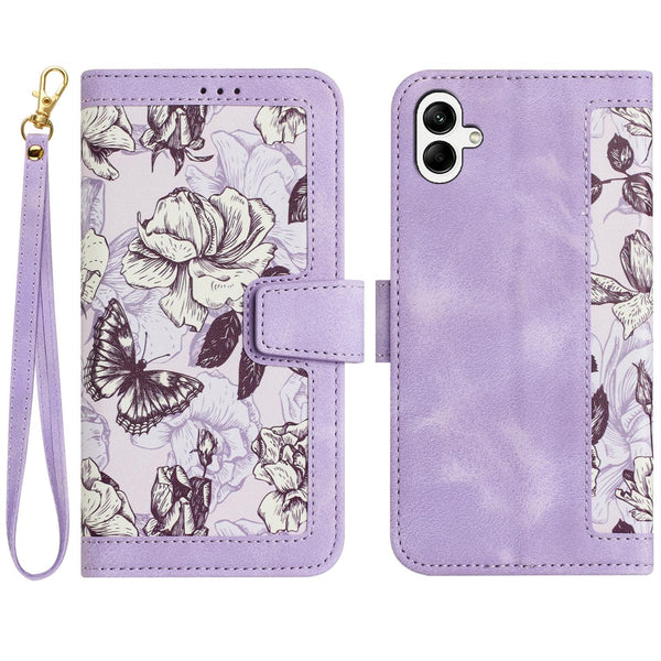 For Samsung Galaxy A04e Floral Pattern Leather Phone Case with Lanyard(Light Purple)