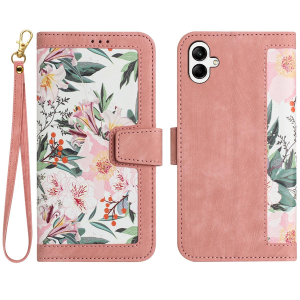 For Samsung Galaxy A04e Floral Pattern Leather Phone Case with Lanyard(Pink)