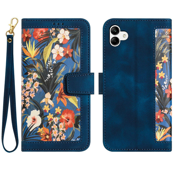 For Samsung Galaxy A05 Floral Pattern Leather Phone Case with Lanyard(Dark Blue)