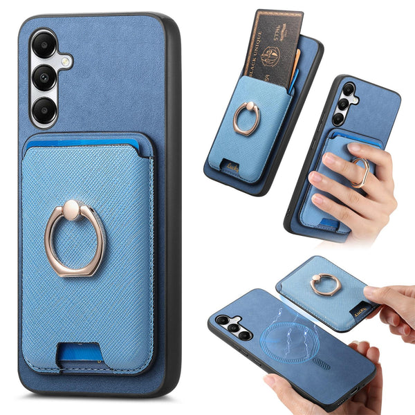 For Samsung Galaxy A05s Retro Cross Leather Ring Vertical Insert Card Bag MagSafe Phone Case(Blue)