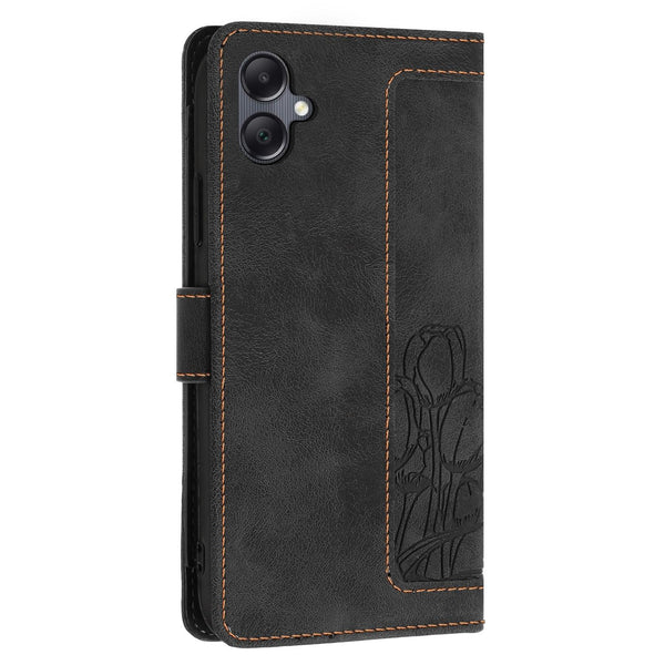 For Samsung Galaxy A06 4G Tulips Embossed Leather Phone Case with Lanyard(Black)