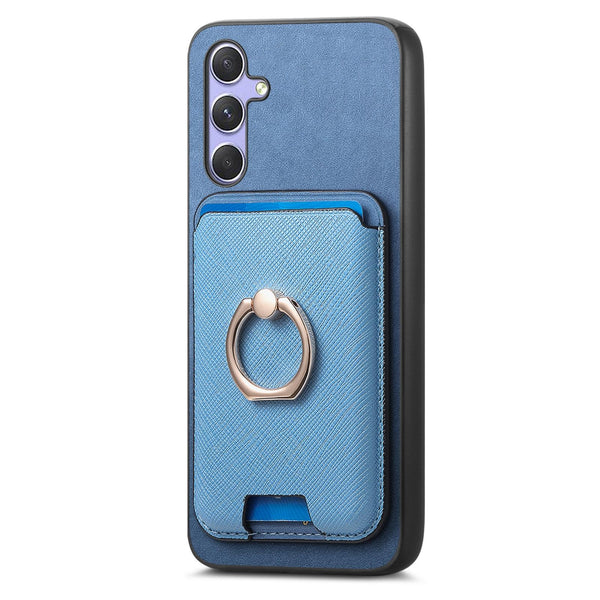 For Samsung Galaxy A14 Retro Cross Leather Ring Vertical Insert Card Bag MagSafe Phone Case(Blue)
