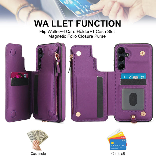 For Samsung Galaxy A15 4G / 5G Double Flap Zipper RFID Leather Phone Case with Short Lanyard(Dark Purple)