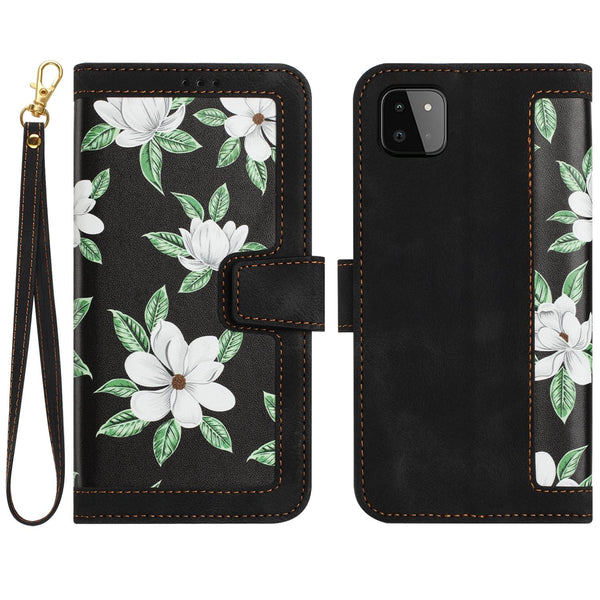 For Samsung Galaxy A22 5G Floral Pattern Leather Phone Case with Lanyard(Black)