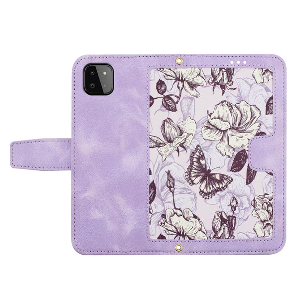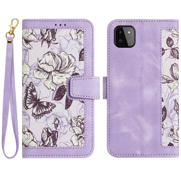 For Samsung Galaxy A22 5G Floral Pattern Leather Phone Case with Lanyard(Light Purple)