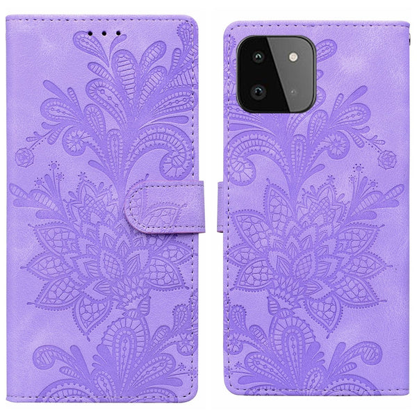 For Samsung Galaxy A22 5G Lace Floral Embossed Magnetic Buckle PU Phone Case With Wrist Strap(Purple)