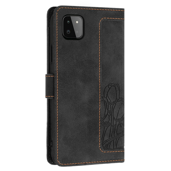 For Samsung Galaxy A22 5G Tulips Embossed Leather Phone Case with Lanyard(Black)