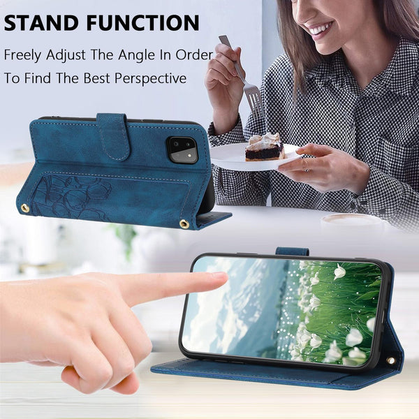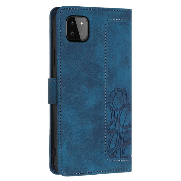 For Samsung Galaxy A22 5G Tulips Embossed Leather Phone Case with Lanyard(Blue)