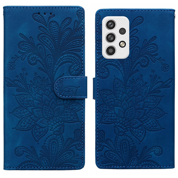For Samsung Galaxy A23 5G Lace Floral Embossed Magnetic Buckle PU Phone Case With Wrist Strap(Blue)