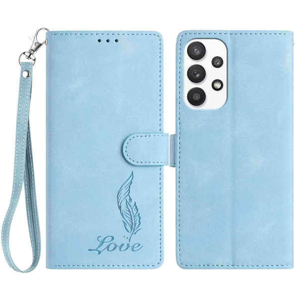 For Samsung Galaxy A23 5G Skin Feel Embossed Feather Leather Phone Case(Light Blue)