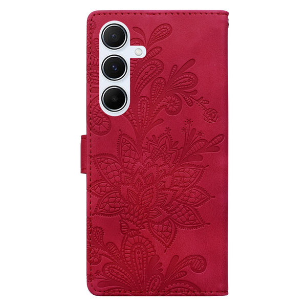 For Samsung Galaxy A25 5G Lace Floral Embossed Magnetic Buckle PU Phone Case With Wrist Strap(Red)