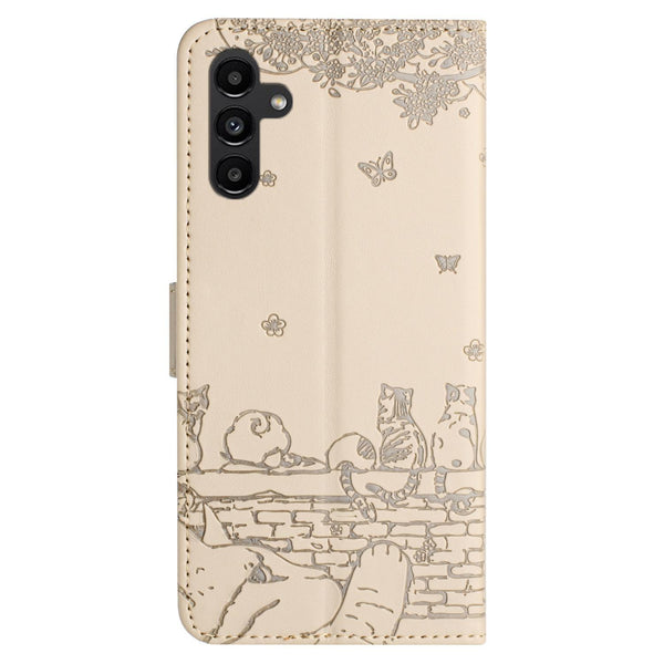 For Samsung Galaxy A26 5G Cat Embossing Pattern Leather Phone Case with Lanyard(Beige)