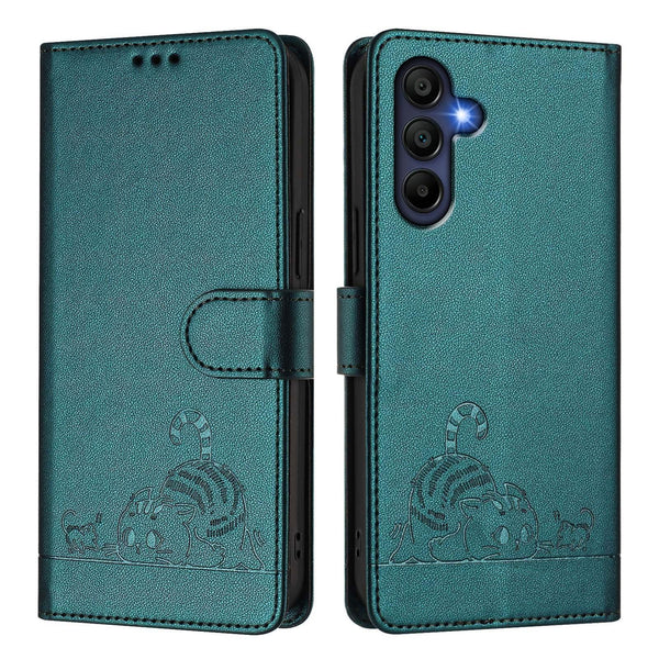 For Samsung Galaxy A26 5G Cat Rat Embossed Pattern RFID Leather Phone Case with Lanyard(Peacock Green)