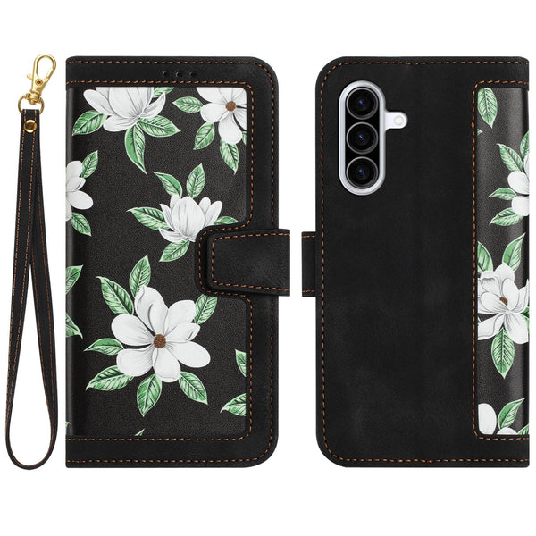 For Samsung Galaxy A26 5G Floral Pattern Leather Phone Case with Lanyard(Black)