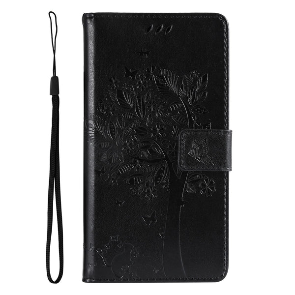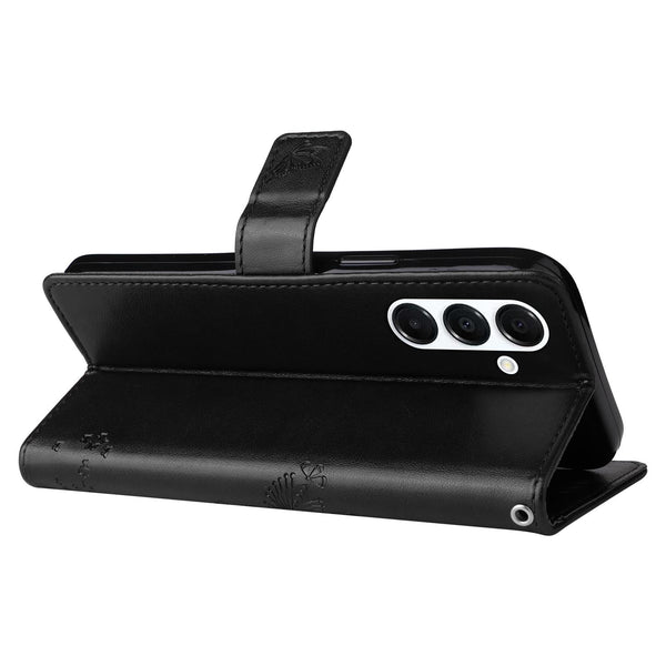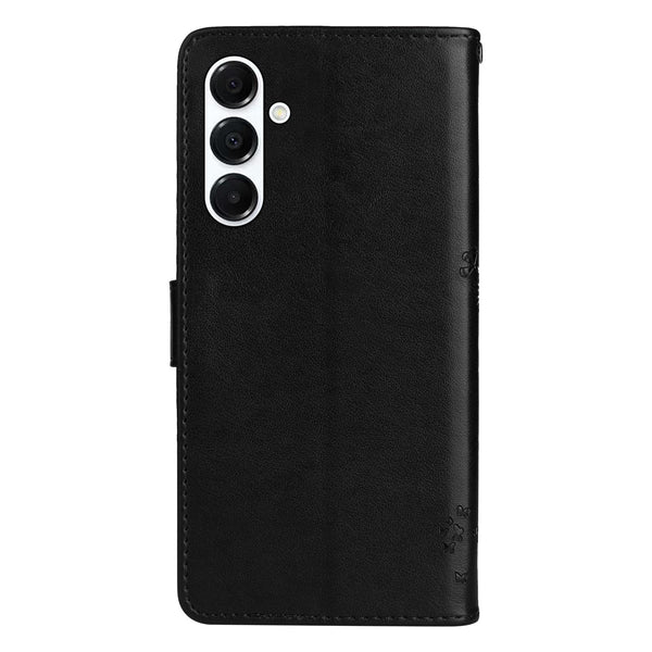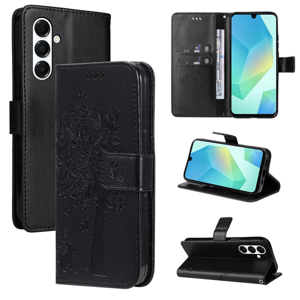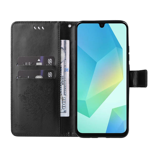 For Samsung Galaxy A26 5G Global Tree & Cat Embossed Pattern Flip Leather Phone Case(Black)