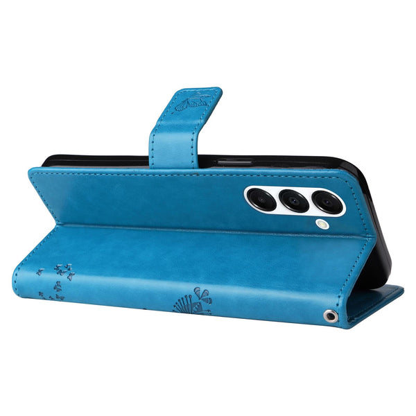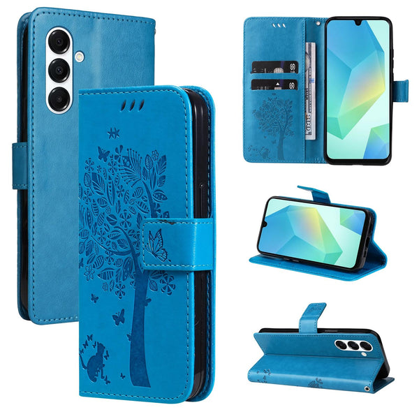 For Samsung Galaxy A26 5G Global Tree & Cat Embossed Pattern Flip Leather Phone Case(Blue)