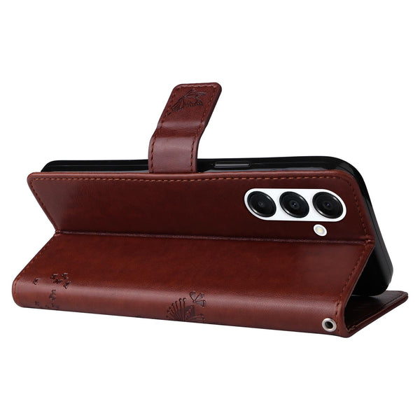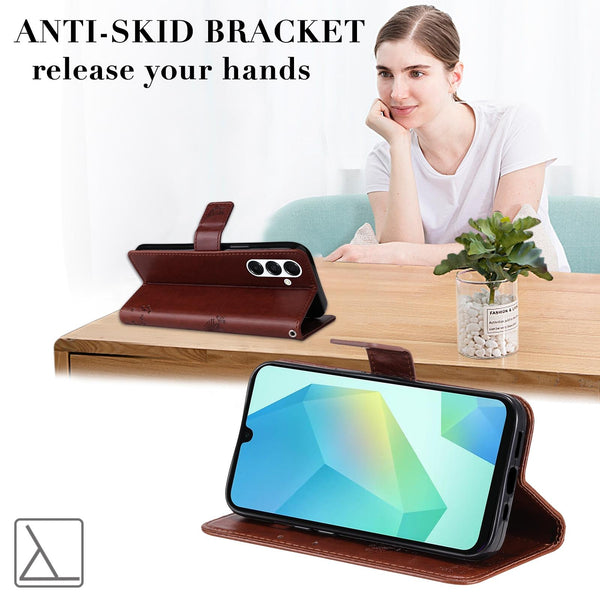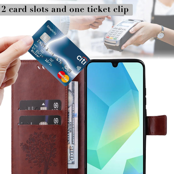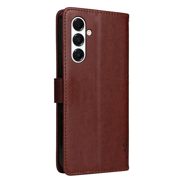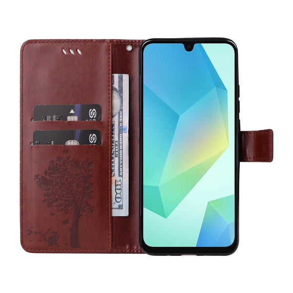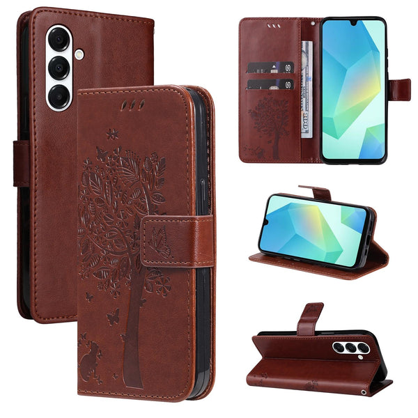 For Samsung Galaxy A26 5G Global Tree & Cat Embossed Pattern Flip Leather Phone Case(Coffee)