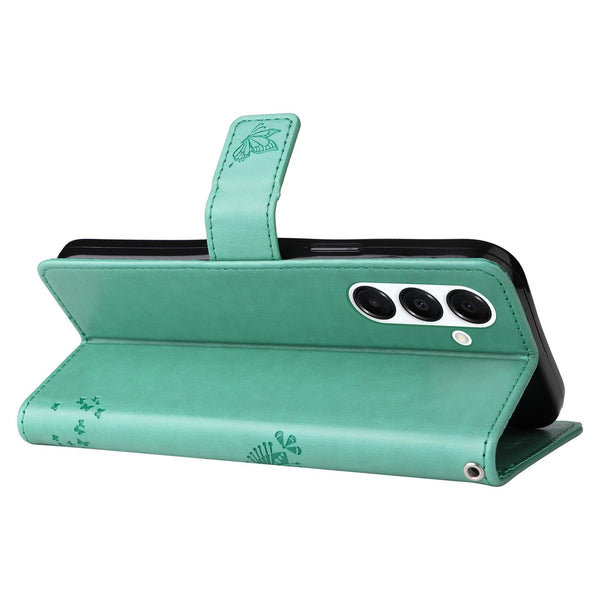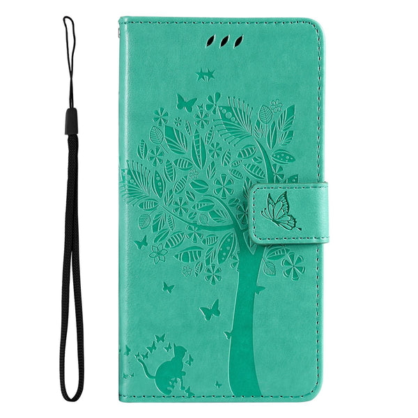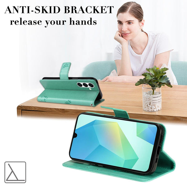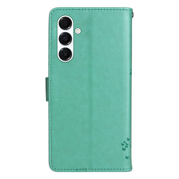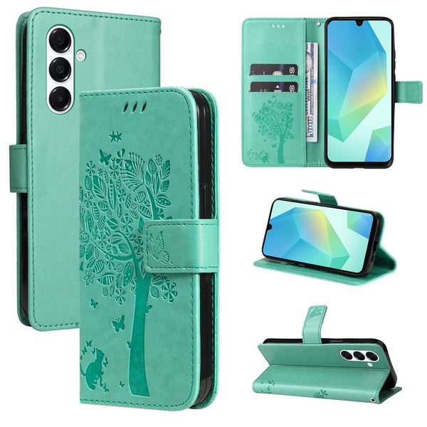 For Samsung Galaxy A26 5G Global Tree & Cat Embossed Pattern Flip Leather Phone Case(Green)