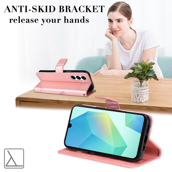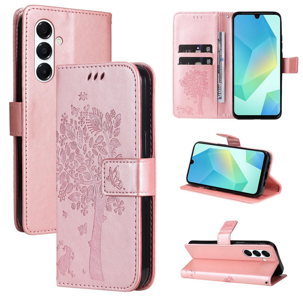 For Samsung Galaxy A26 5G Global Tree & Cat Embossed Pattern Flip Leather Phone Case(Rose Gold)