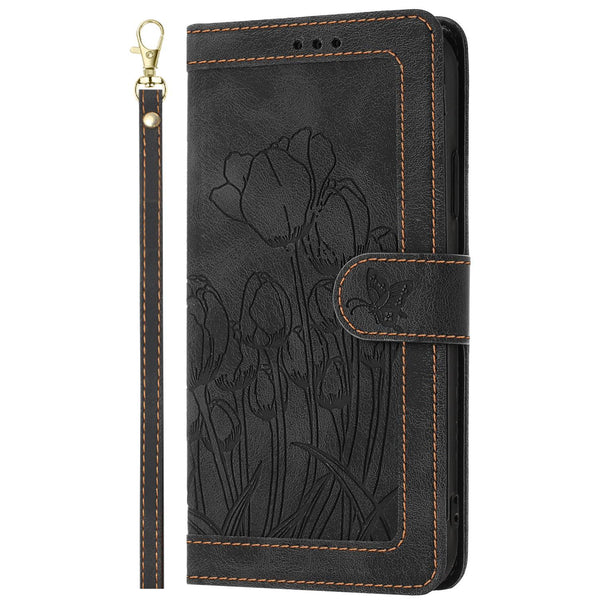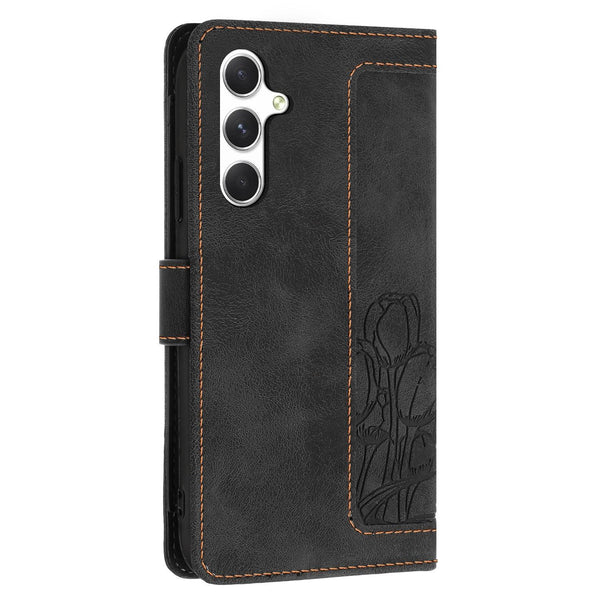 For Samsung Galaxy A26 5G Tulips Embossed Leather Phone Case with Lanyard(Black)