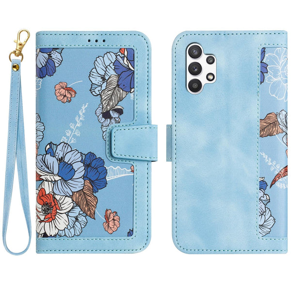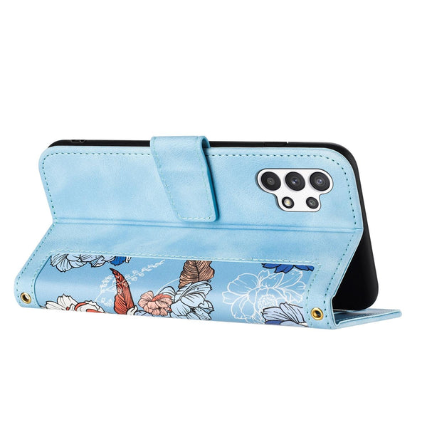 For Samsung Galaxy A32 5G Floral Pattern Leather Phone Case with Lanyard(Light Blue)