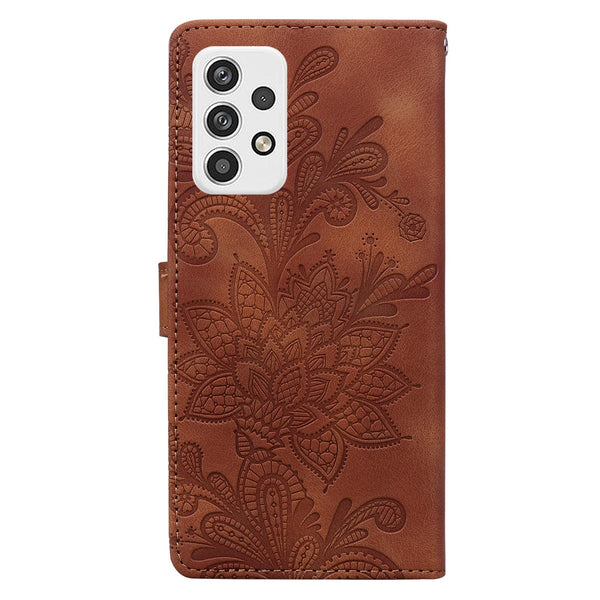 For Samsung Galaxy A32 5G Lace Floral Embossed Magnetic Buckle PU Phone Case With Wrist Strap(Brown)