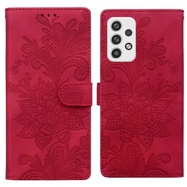 For Samsung Galaxy A32 5G Lace Floral Embossed Magnetic Buckle PU Phone Case With Wrist Strap(Red)