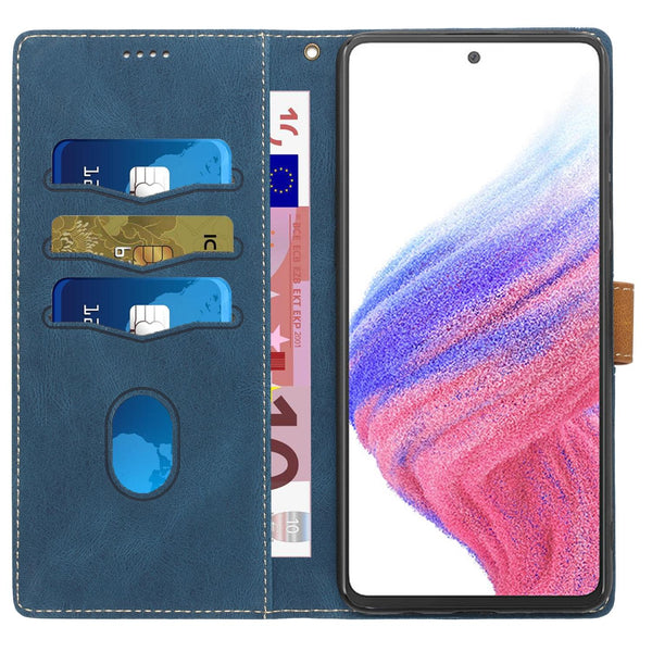 For Samsung Galaxy A33 5G Grid Stitching Leather Phone Case with Lanyard(Blue)