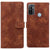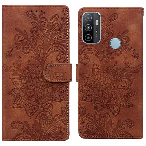 For Samsung Galaxy A33 5G Lace Floral Embossed Magnetic Buckle PU Phone Case With Wrist Strap(Brown)