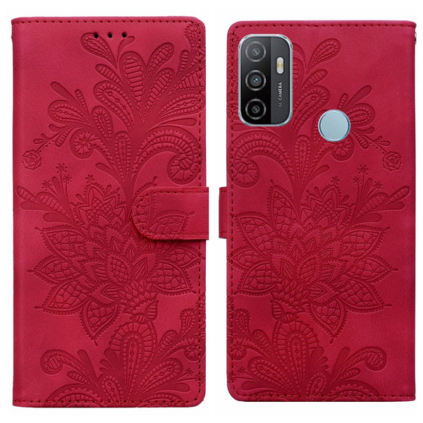 For Samsung Galaxy A33 5G Lace Floral Embossed Magnetic Buckle PU Phone Case With Wrist Strap(Red)