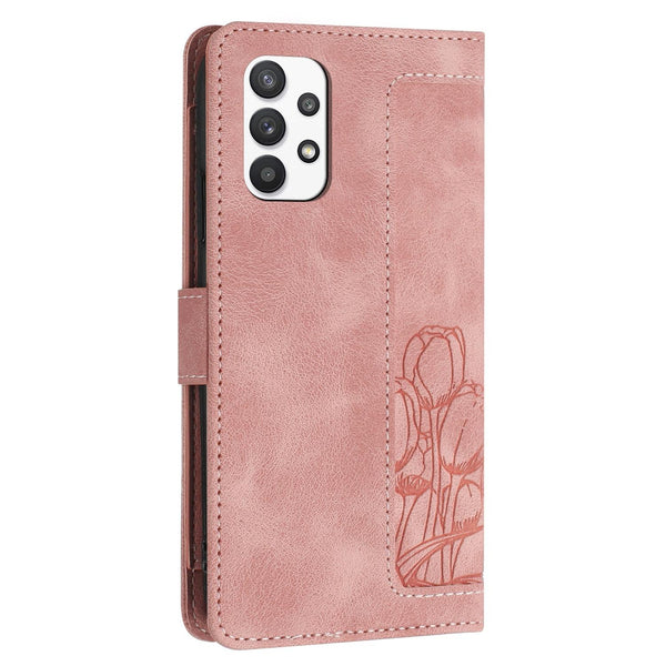 For Samsung Galaxy A33 5G Tulips Embossed Leather Phone Case with Lanyard(Pink)