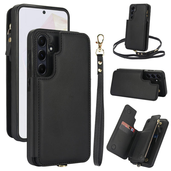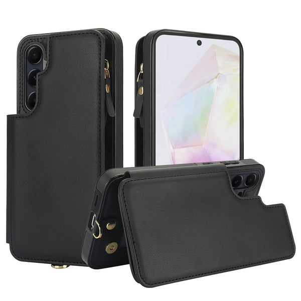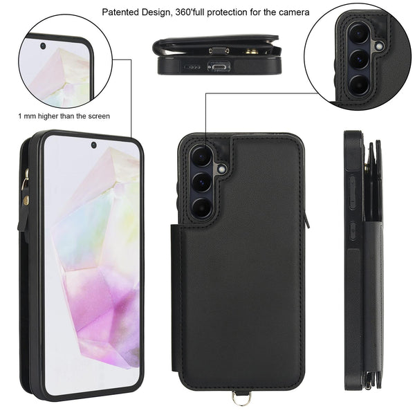 For Samsung Galaxy A35 5G Double Flap Zipper RFID Leather Phone Case with Short Lanyard(Black)