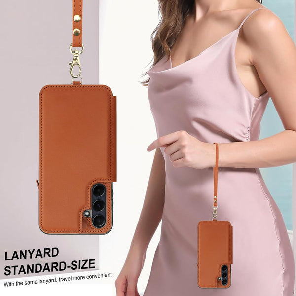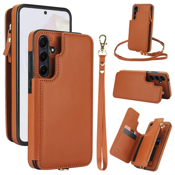 For Samsung Galaxy A35 5G Double Flap Zipper RFID Leather Phone Case with Short Lanyard(Brown)