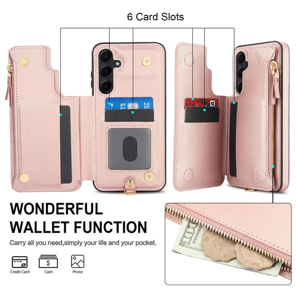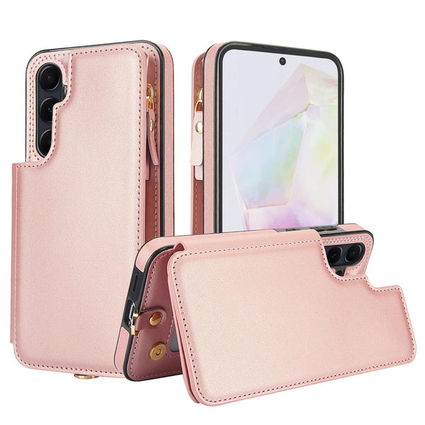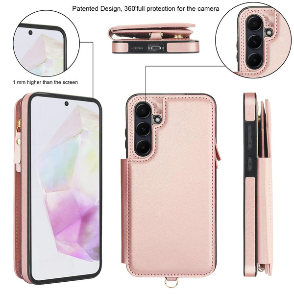 For Samsung Galaxy A35 5G Double Flap Zipper RFID Leather Phone Case with Short Lanyard(Rose Gold)