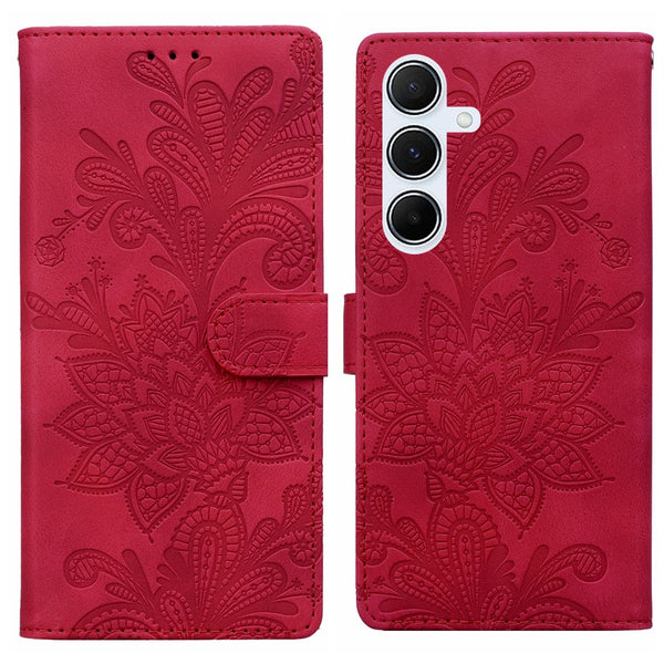 For Samsung Galaxy A35 5G Lace Floral Embossed Magnetic Buckle PU Phone Case With Wrist Strap(Red)