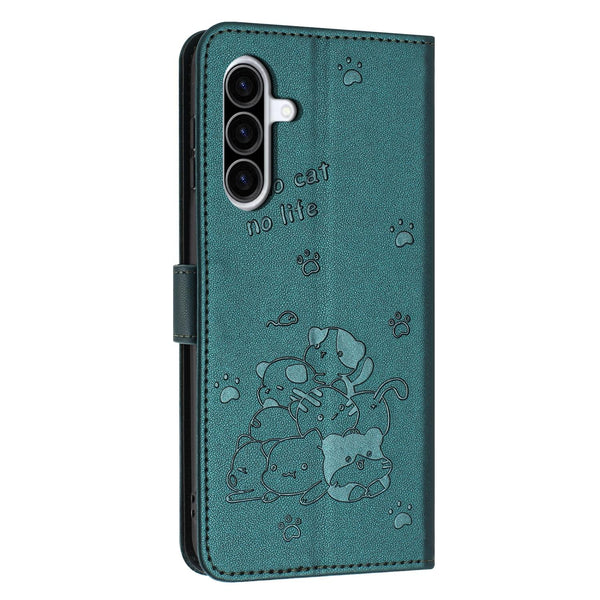 For Samsung Galaxy A36 5G Embossed Kitten Phone Leather Case with Lanyard(Dark Green)