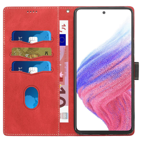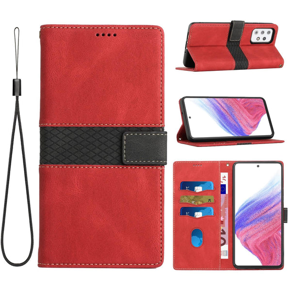 For Samsung Galaxy A52 5G / 4G Grid Stitching Leather Phone Case with Lanyard(Red)